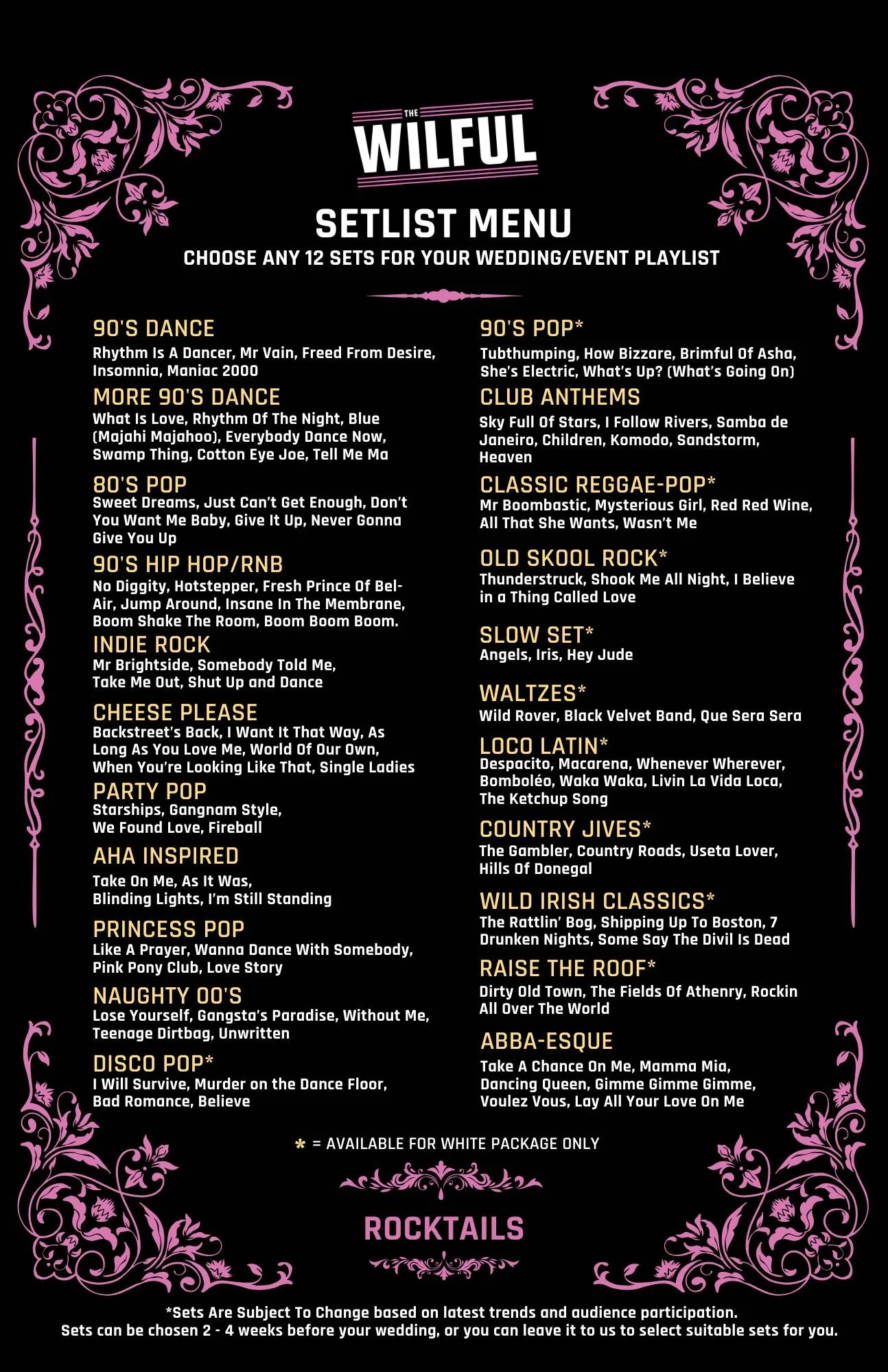 We take on a limited number of weddings each year to ensure every couple gets the full Wilful experience — from performance quality to production and energy.